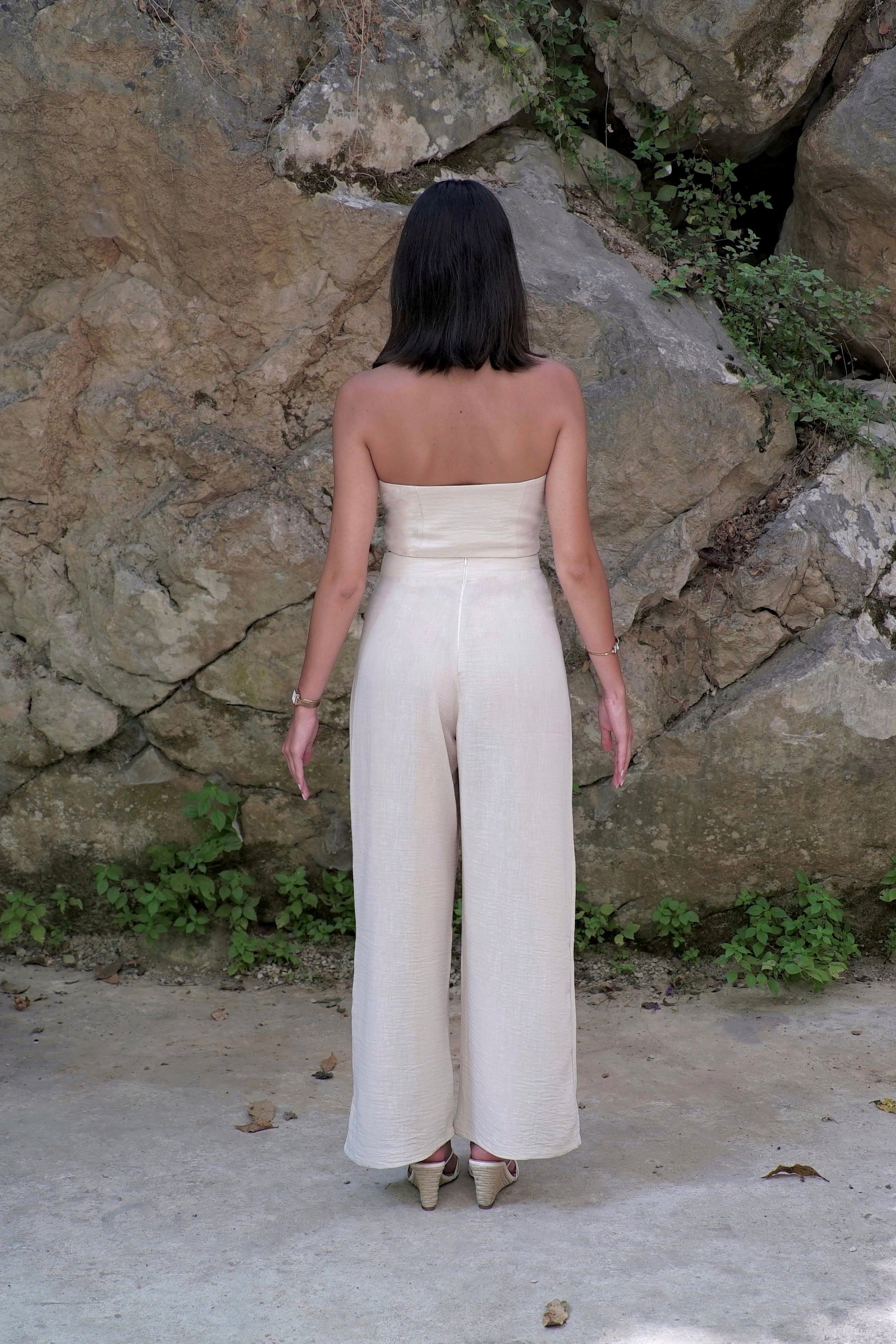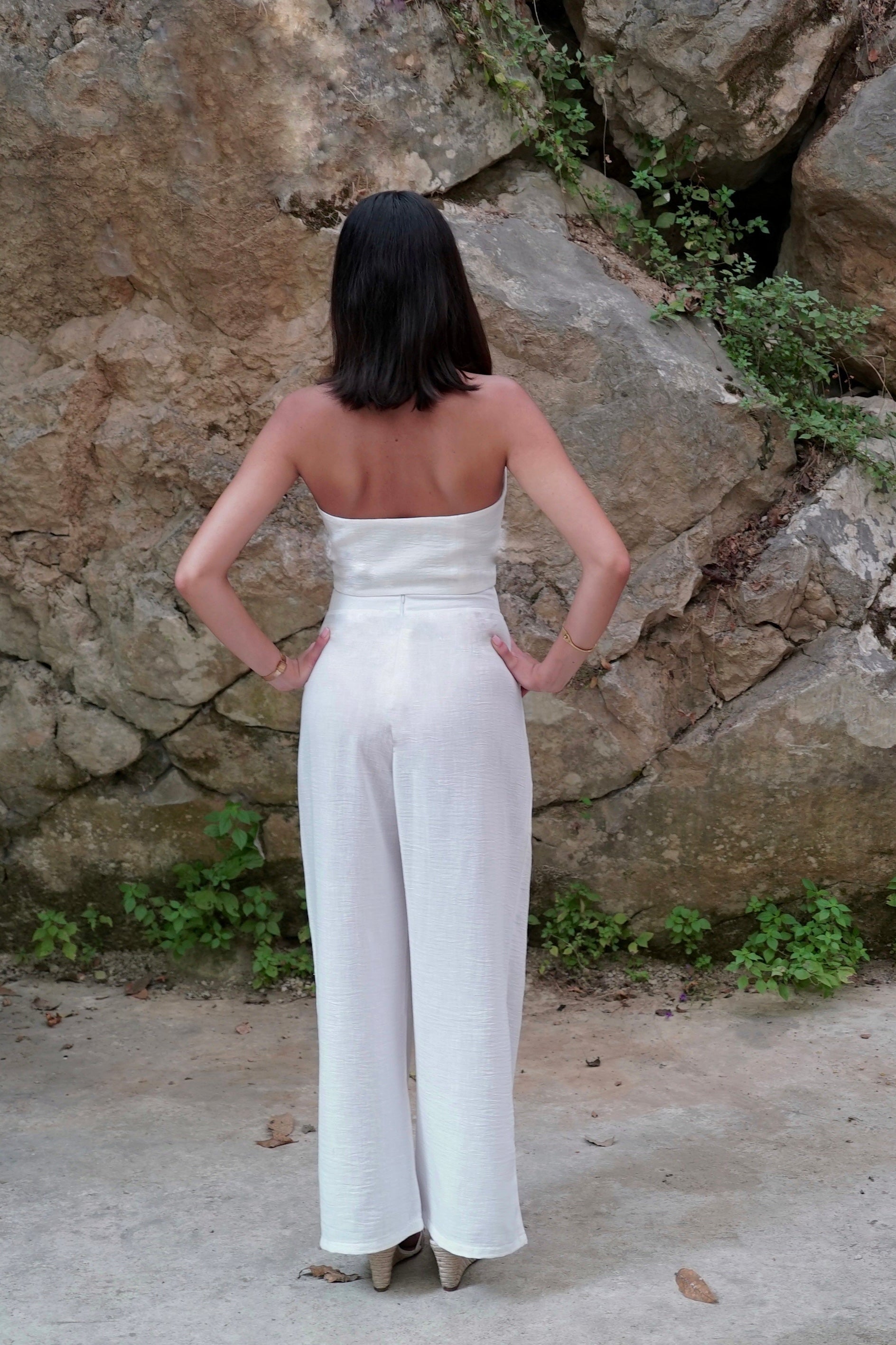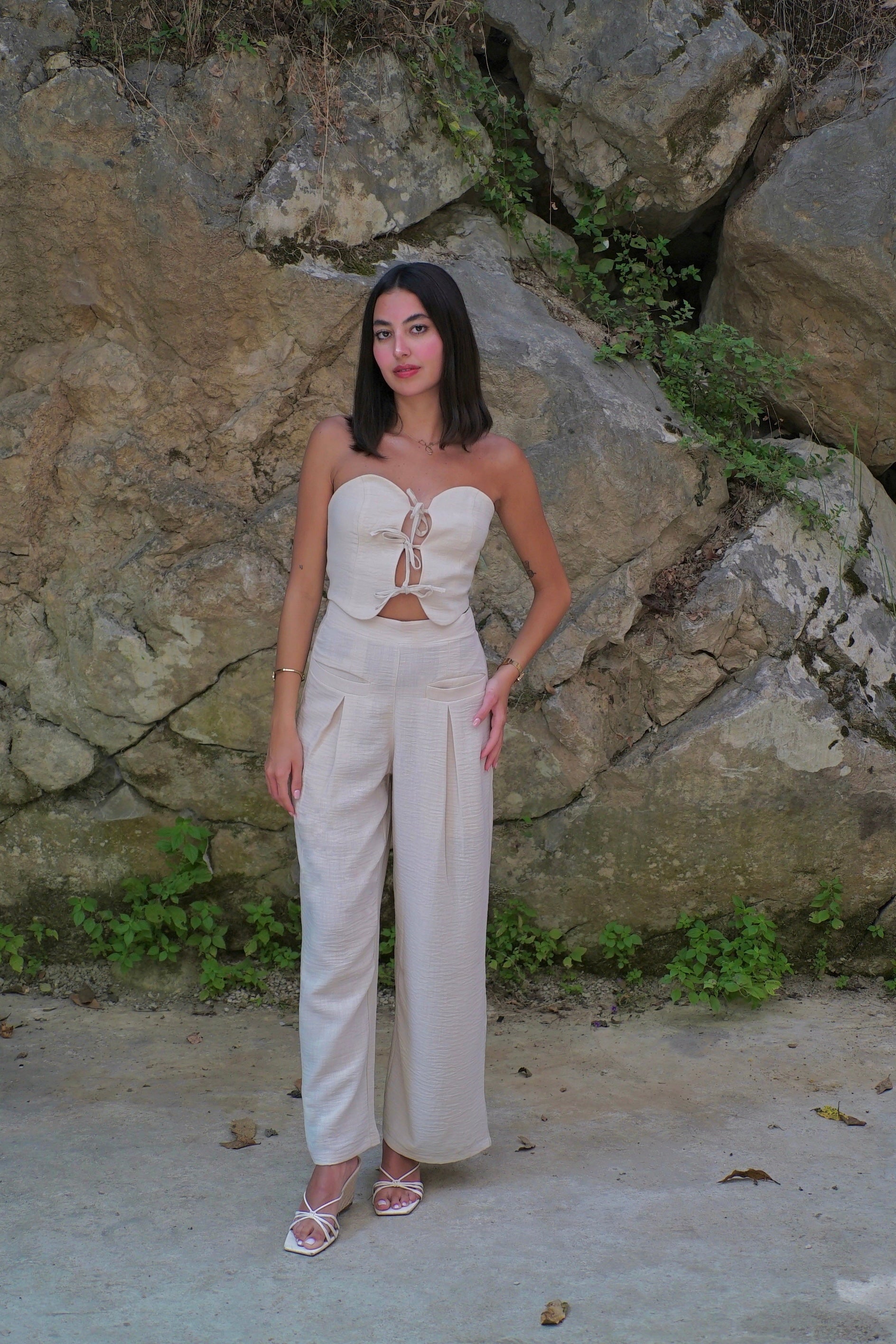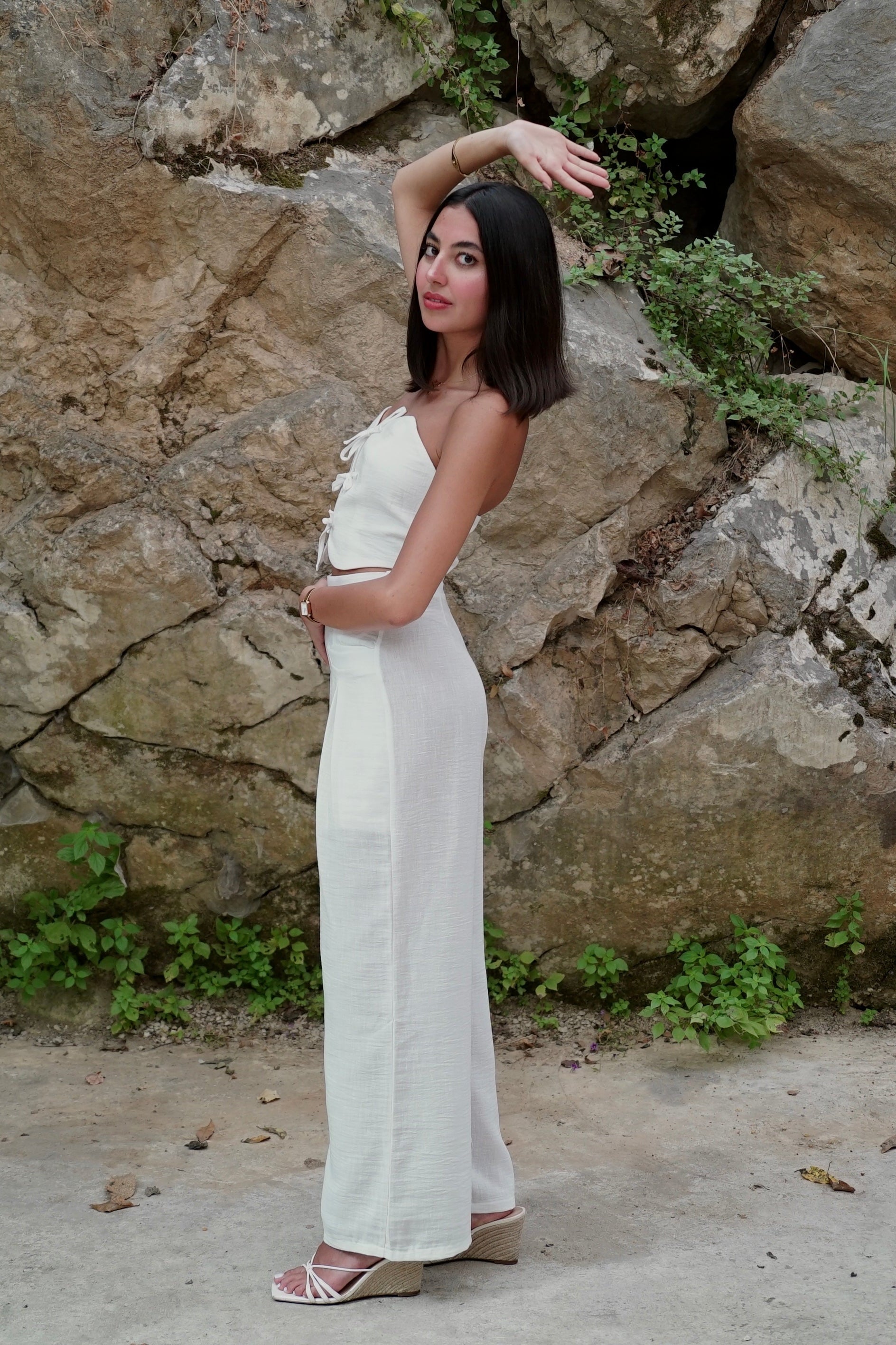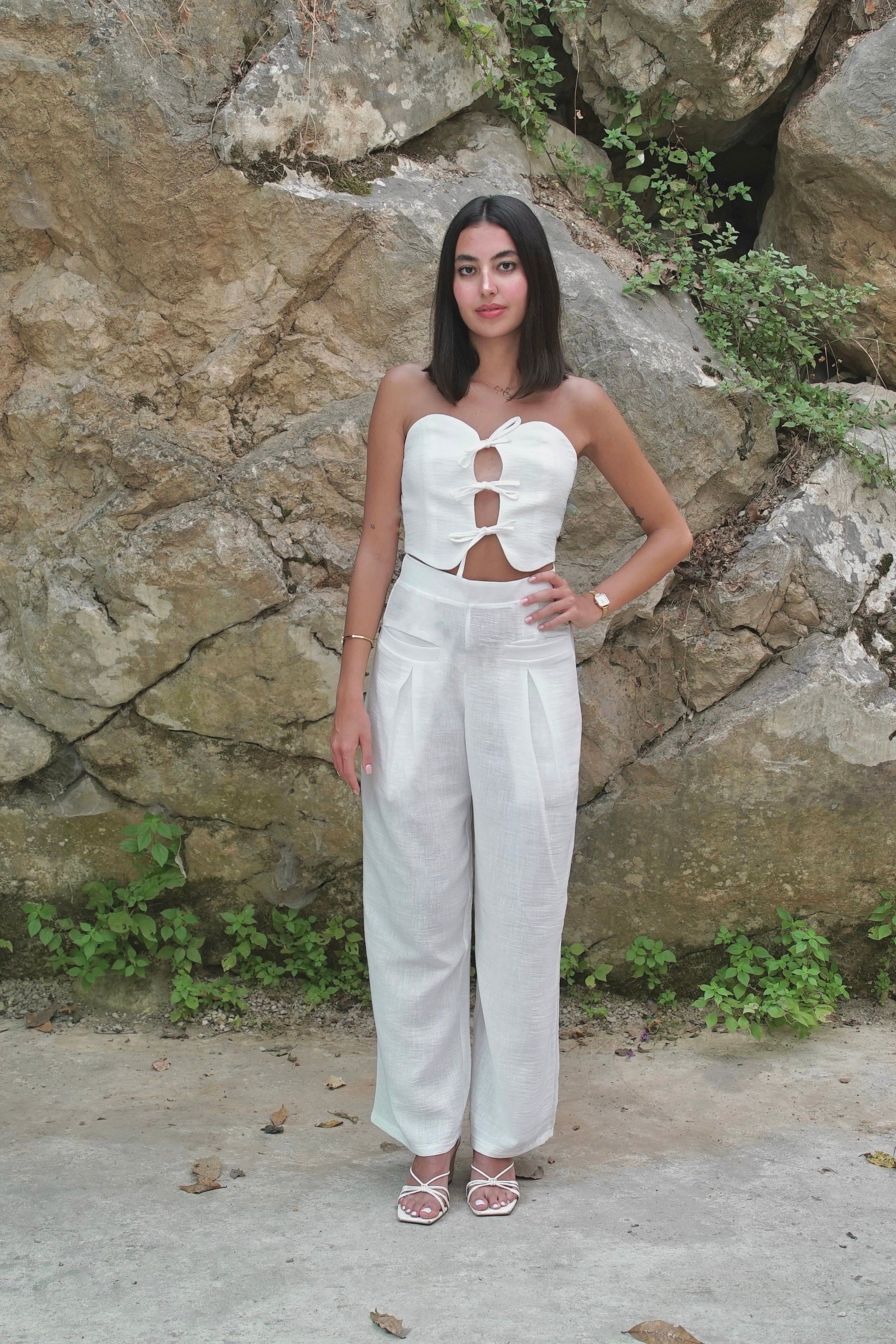 This breezy two-piece set features a bustier top with bold cut-outs and tailored wide-leg pants. A look made to stand out in sunlight and simplicity.