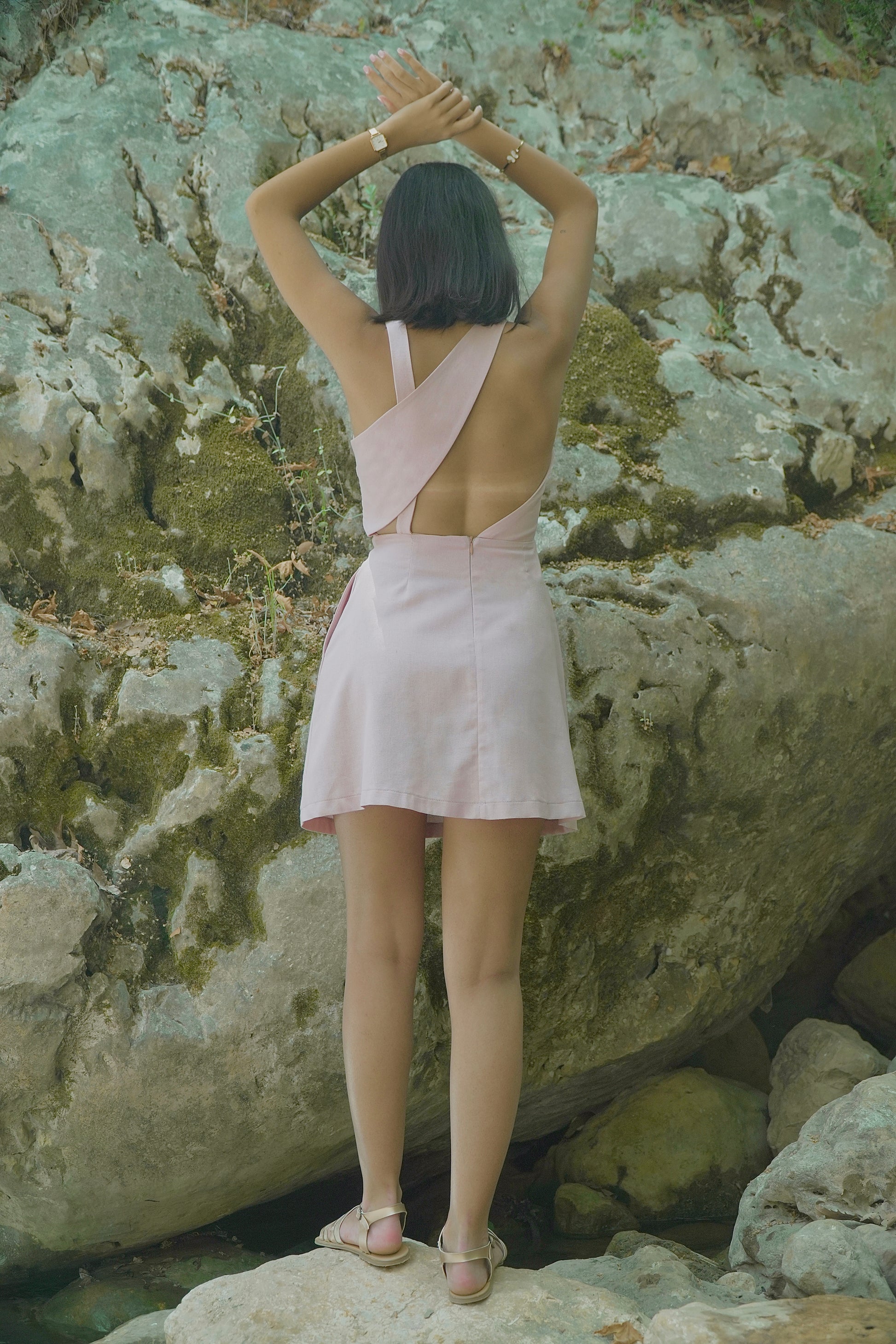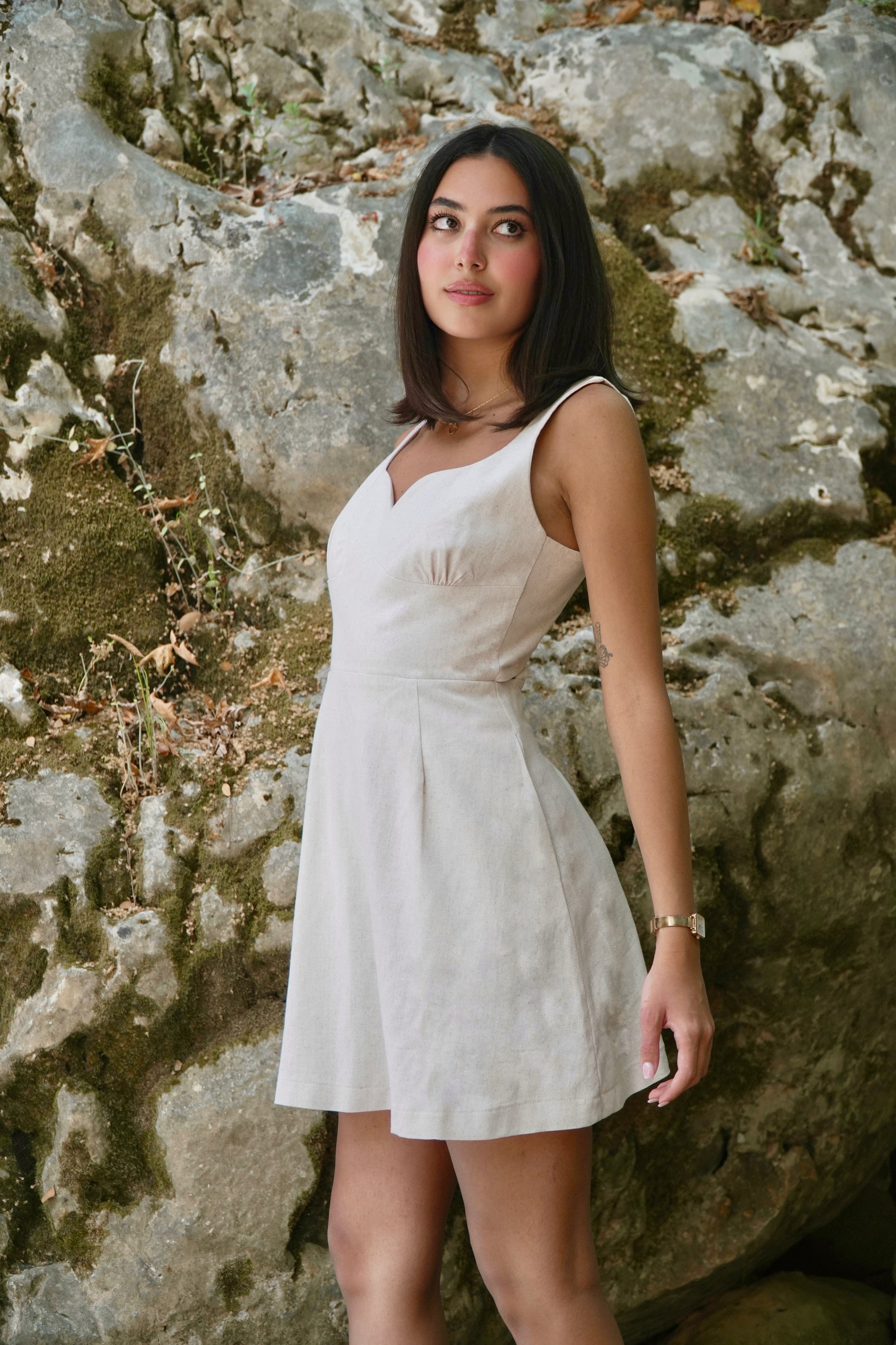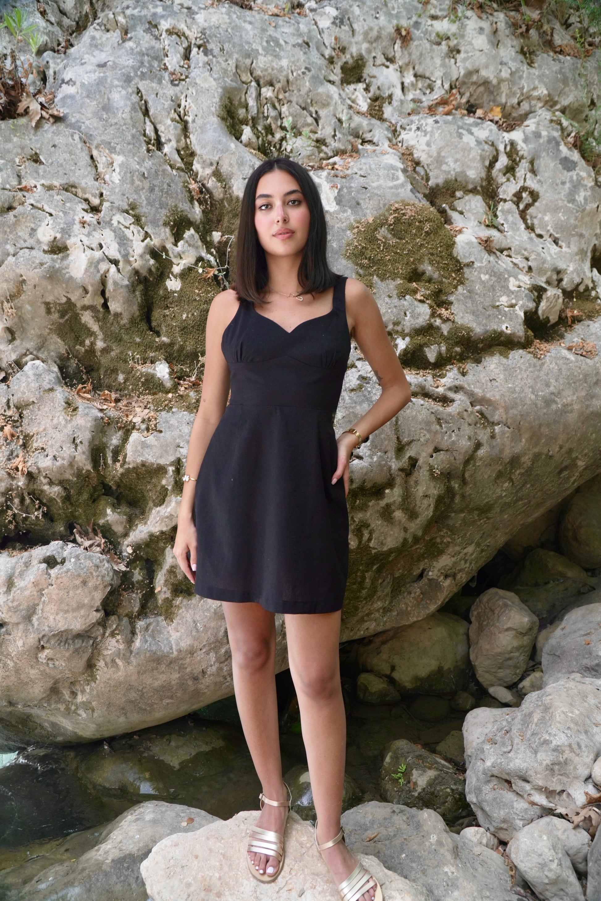 This dress blends elegance with ease. Featuring a heart-shaped neckline, a flowy skirt, and a unique cross-back detail, this dress is made to move with you.