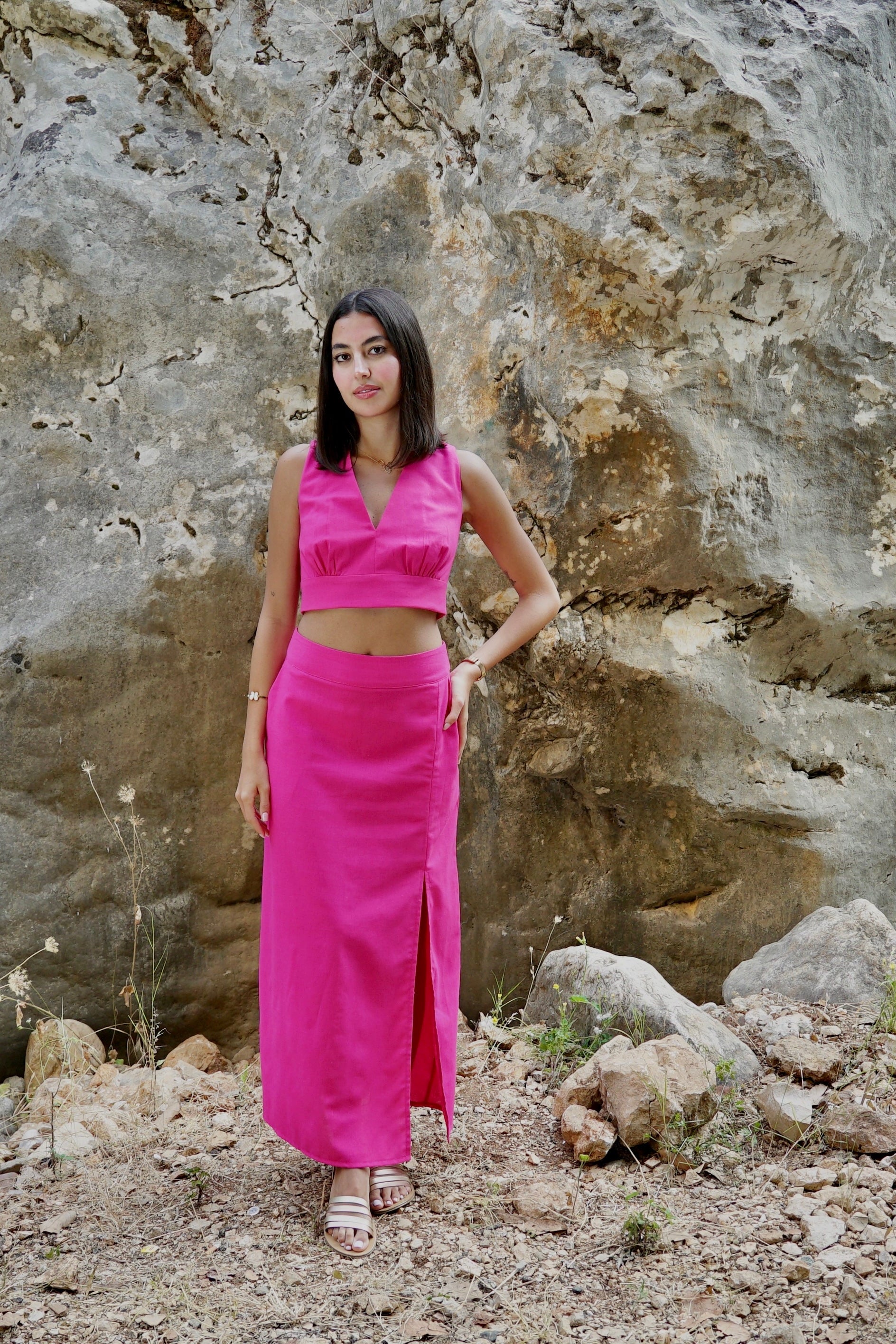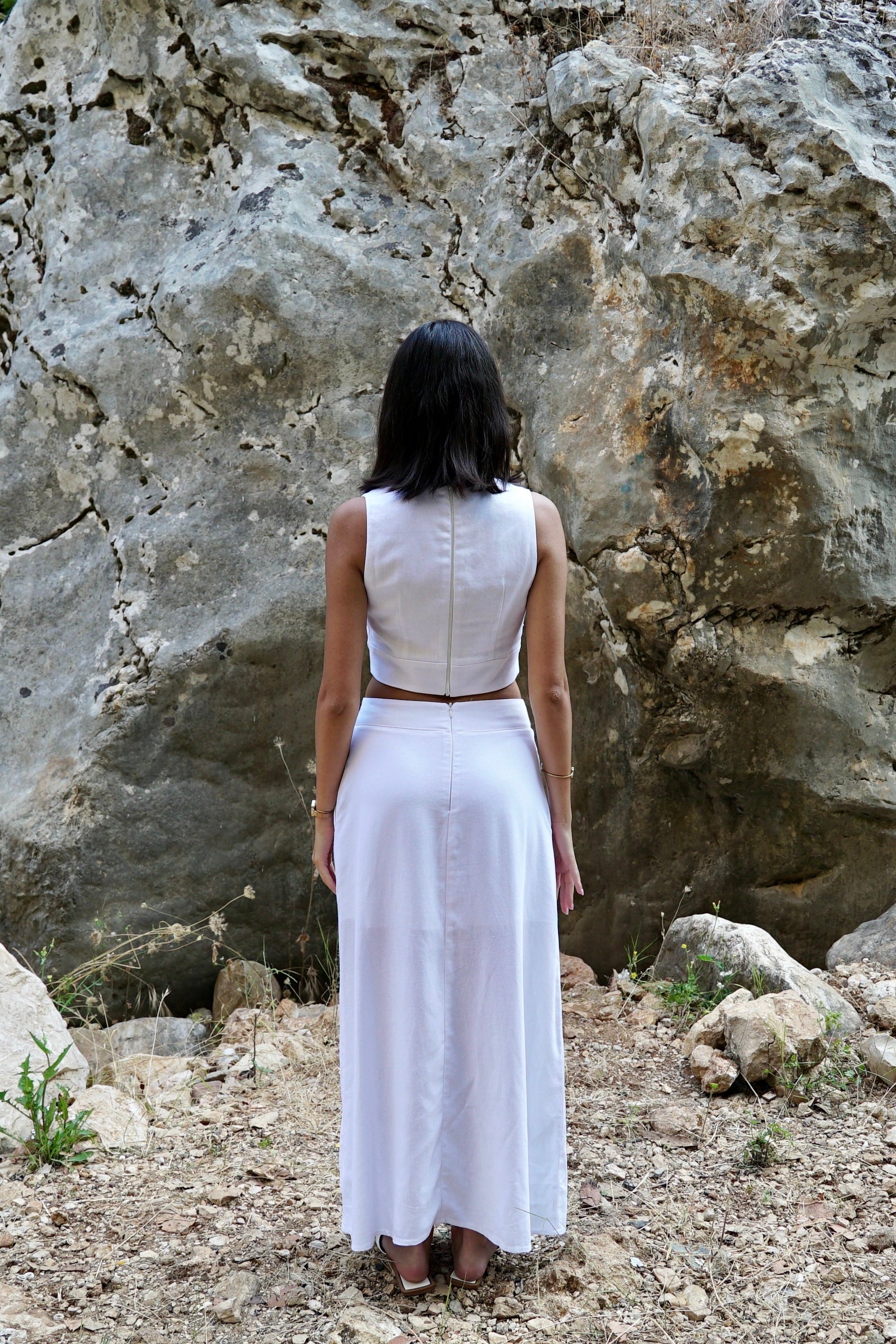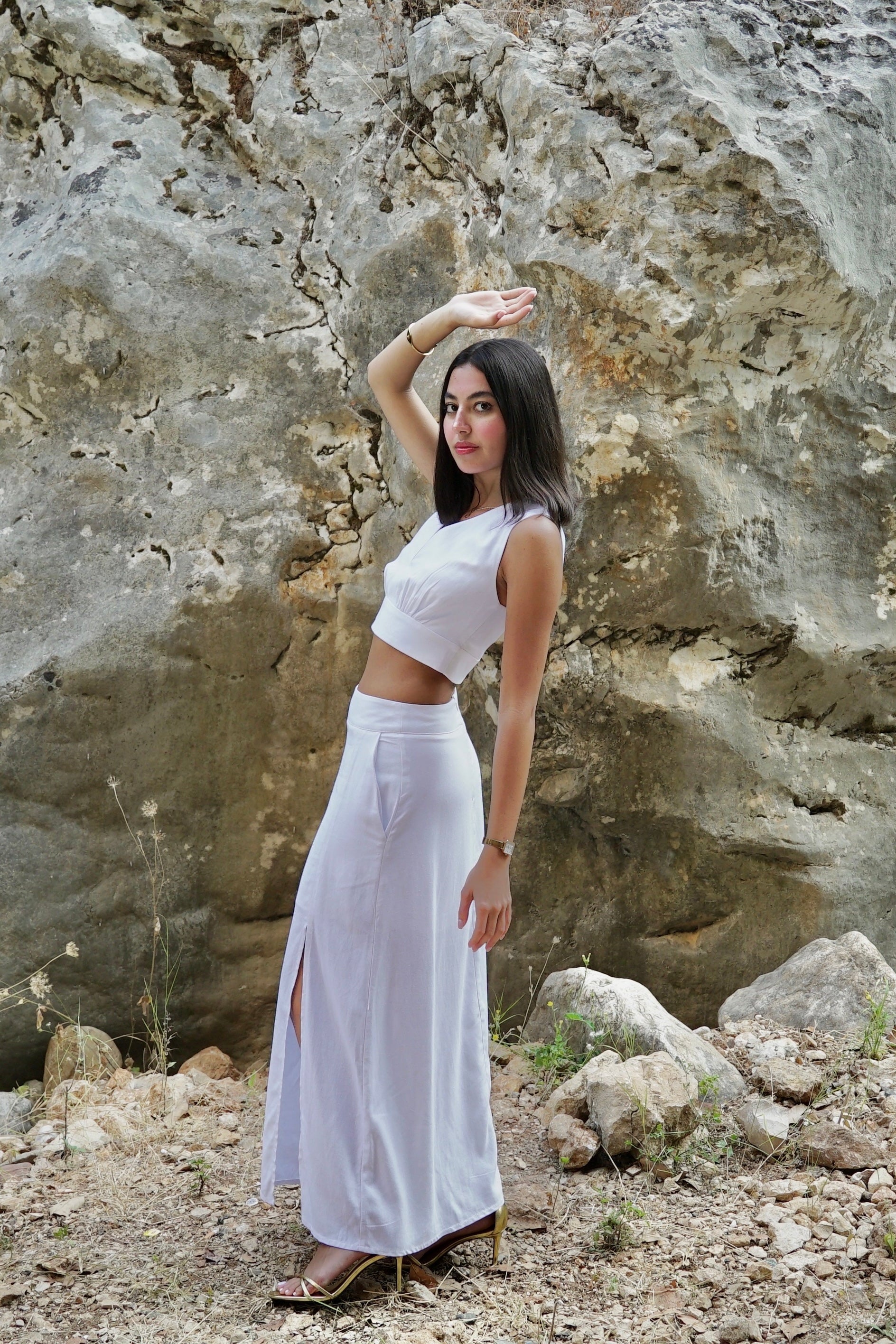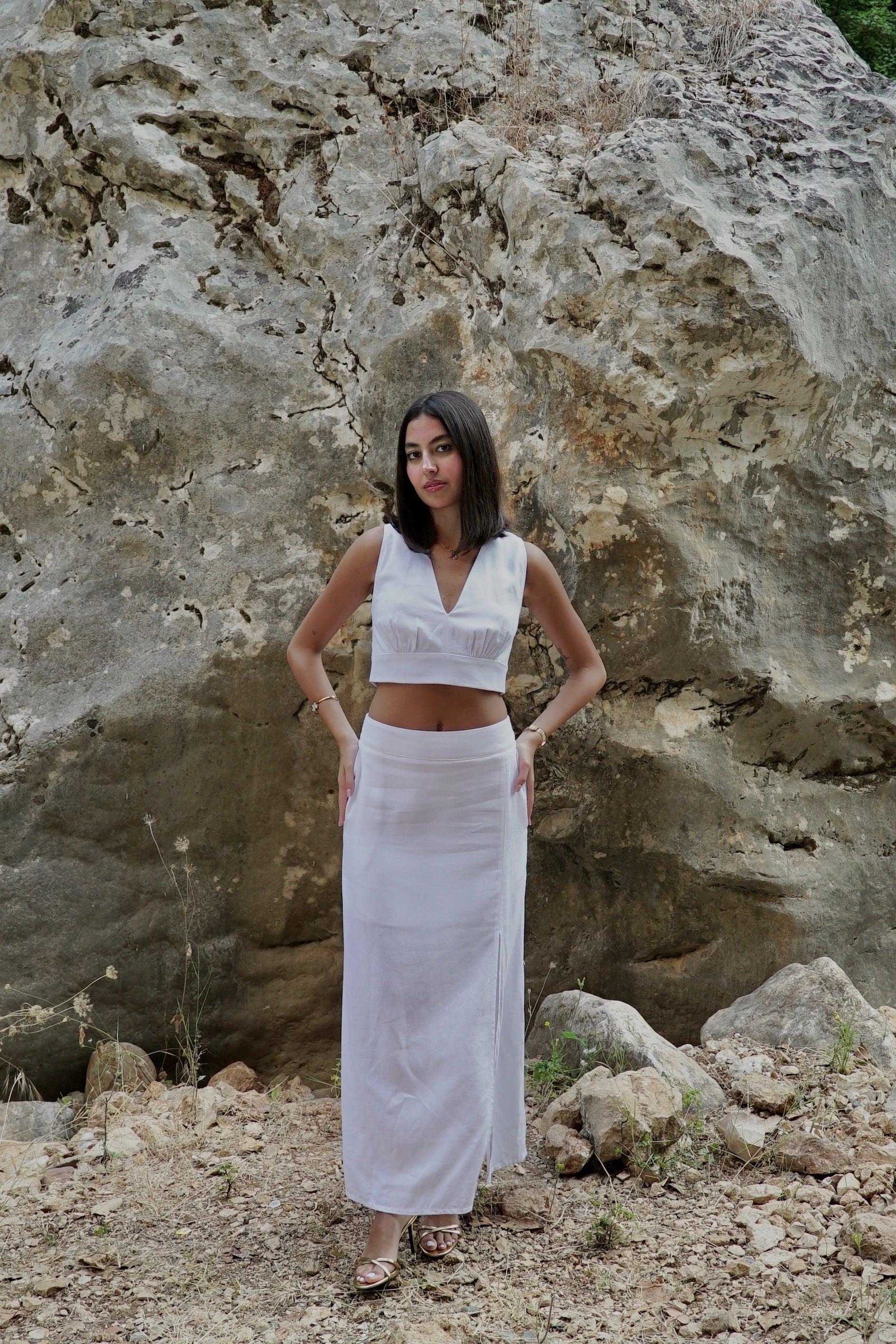 Light meets bold in this two-piece look made for movement, presence, and flow. A minimal bralette paired with a soft, flowing skirt. Choose the color that calls you most.