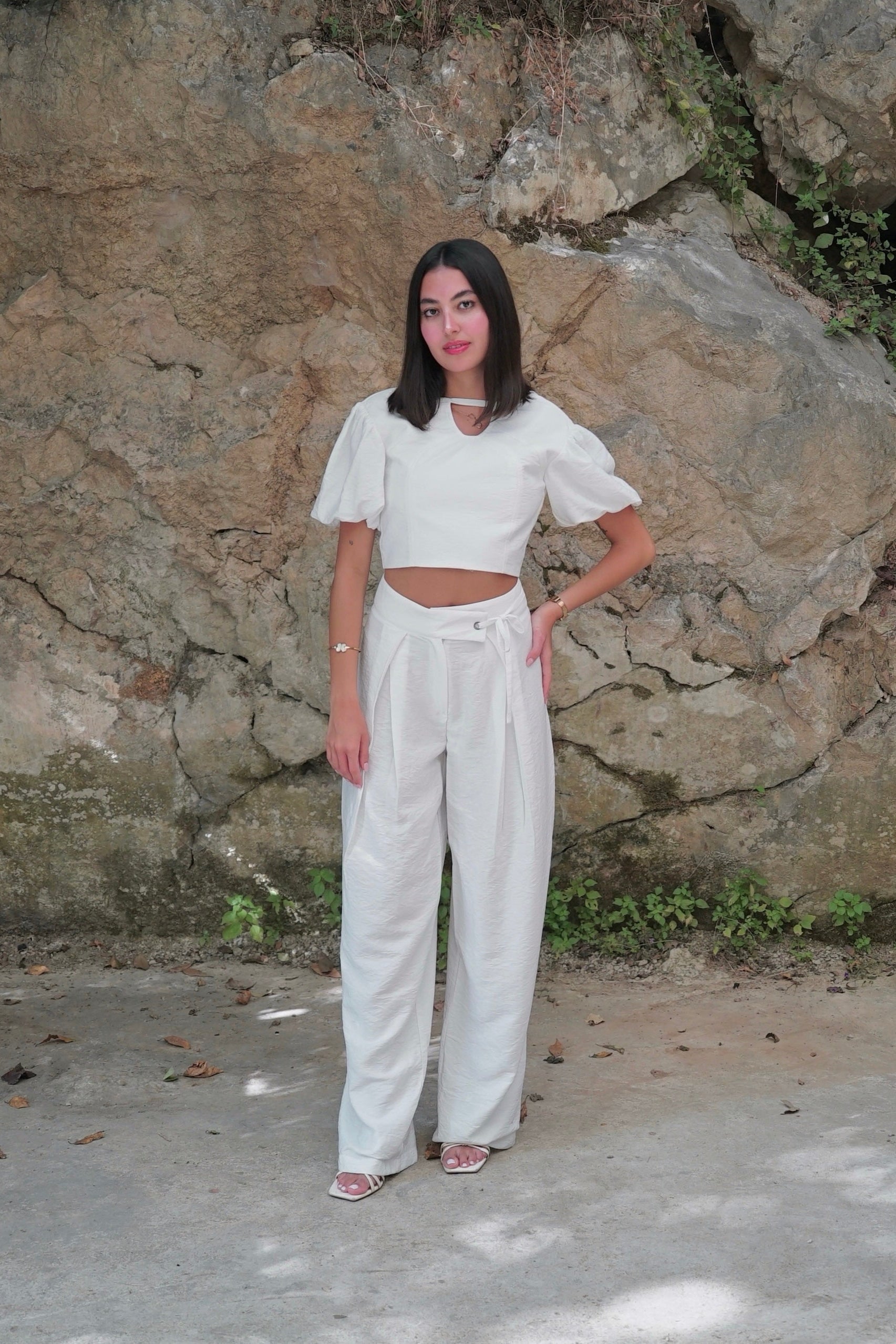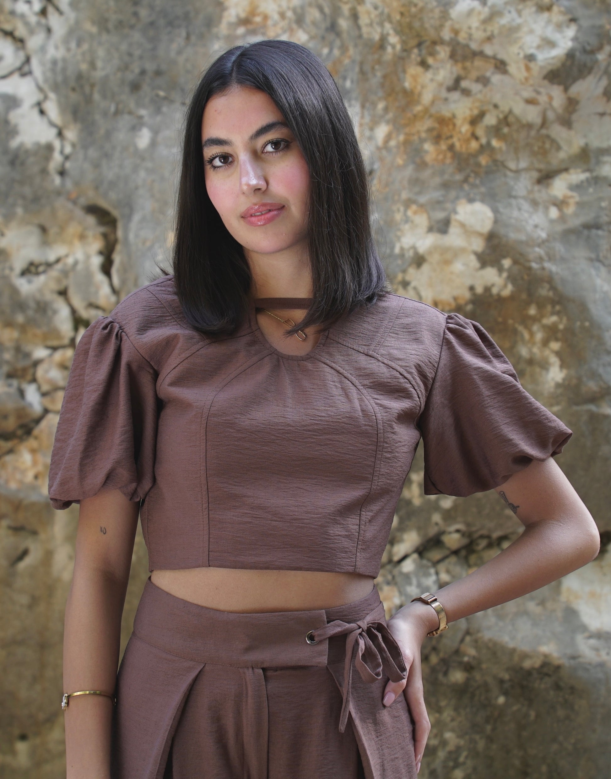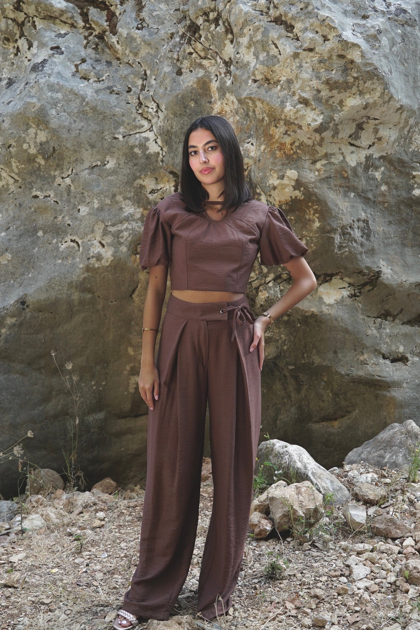 Grounded and flowing. This set pairs a puff-sleeve crop top with high-waisted, pleated wide-leg pants for a silhouette that moves with confidence.