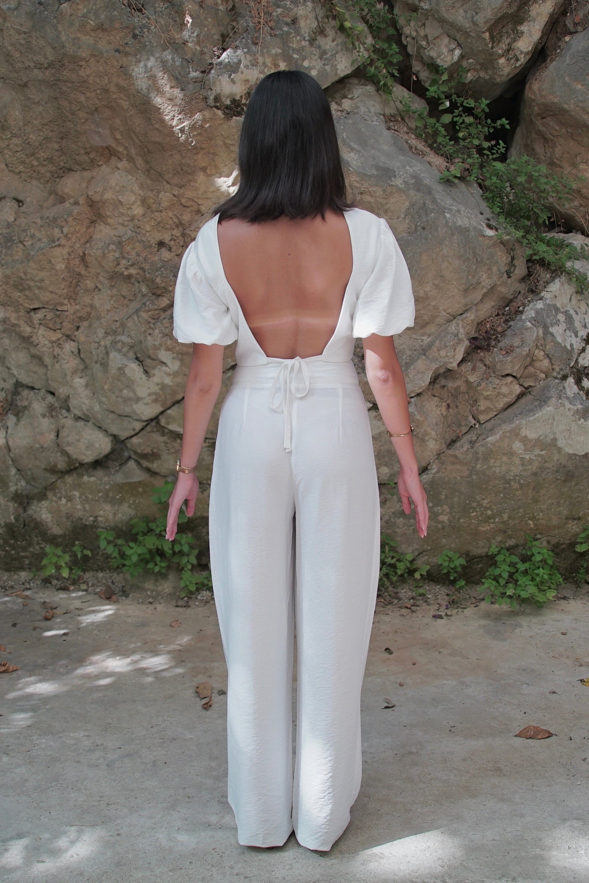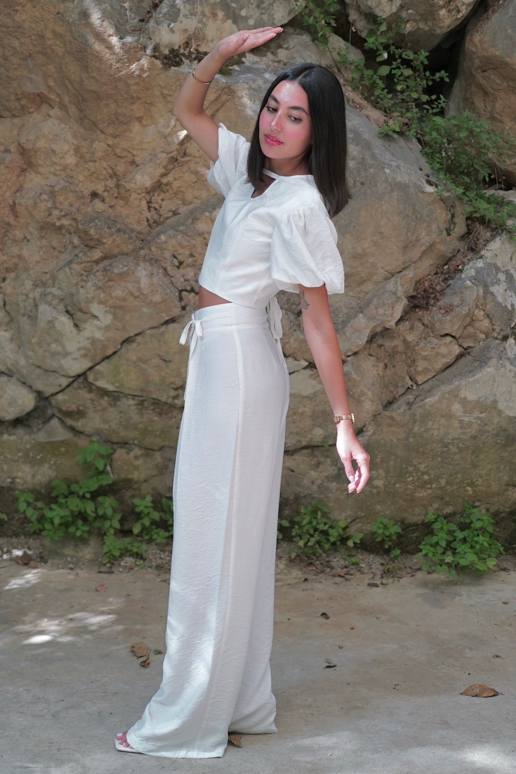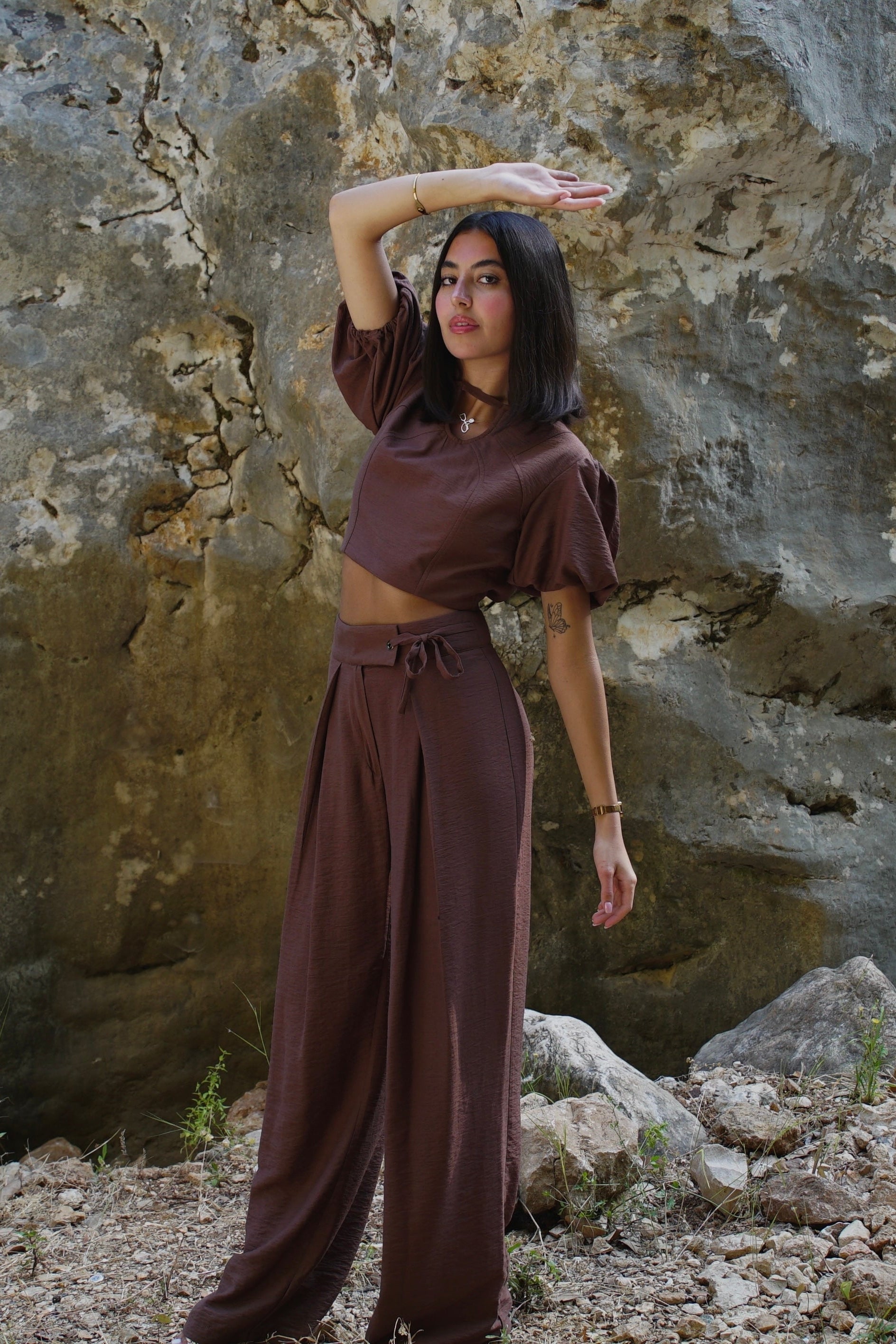 Grounded and flowing. This set pairs a puff-sleeve crop top with high-waisted, pleated wide-leg pants for a silhouette that moves with confidence.